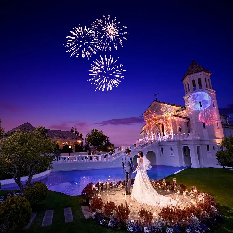 【トワイライトweddingプラン】大阪の夜空に栄える打ち上げ花火**挙式は明るい時間・披露宴のフィナーレには夜景になる人気の時間帯♪花火とあわせてプロジェクションマッピング演出も可能!